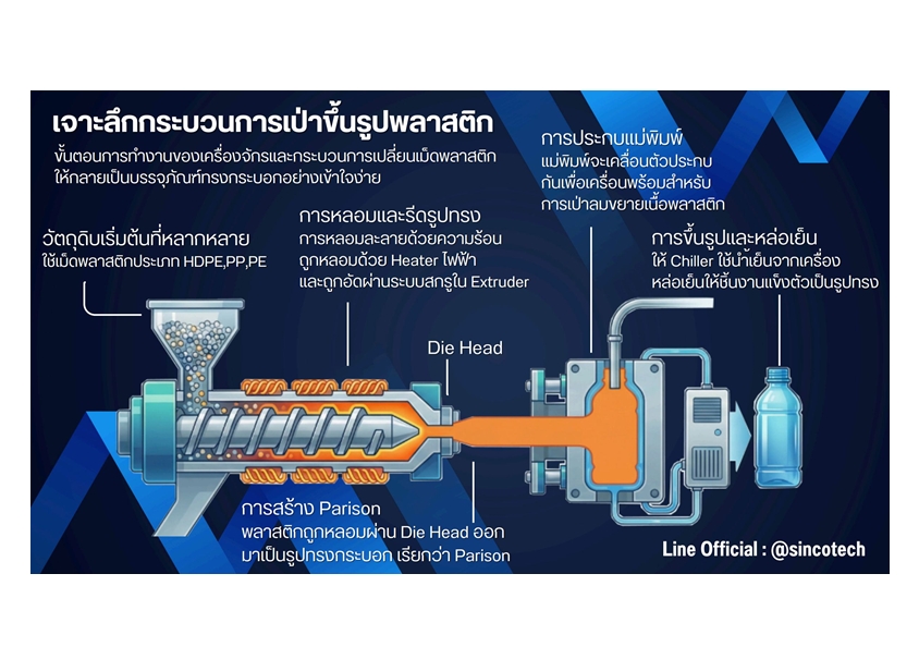 กระบวนการเป่า Blow Molding คือเทคนิคการผลิตภาชนะพลาสติกด้วยการใช้ความร้อนหลอมละลายเม็ดพลาสติกผ่านกระบวนการจนกลายเป็นรูปทรงกระบอกหรือ Parison โดยใช้ระบบไฮดรอลิกในการขับเคลื่อนเครื่องจักรและควบคุมแม่พิมพ์ เมื่อนำชิ้นงานพลาสติกเหลวเข้าสู่แม่พิมพ์แล้วจะมีการ เป่าลม เพื่อให้เนื้อวัสดุขยายตัวจนเกิดรูปร่างตามแม่พิมพ์ที่กำหนดไว้ หลังจากนั้นระบบจะปล่อยน้ำเย็นจากเครื่องทำความเย็นมาช่วยให้พลาสติกแข็งตัว และคงรูปทรงได้อย่างแม่นยำ เทคโนโลยีนี้ได้รับความนิยมอย่างมากในการผลิตบรรจุภัณฑ์ประเภทขวดที่ทำจากวัสดุ HDPE หรือ PP, PE ซึ่งมีความทนทานและใช้งานได้อย่างหลากหลายในอุตสาหกรรมปัจจุบัน