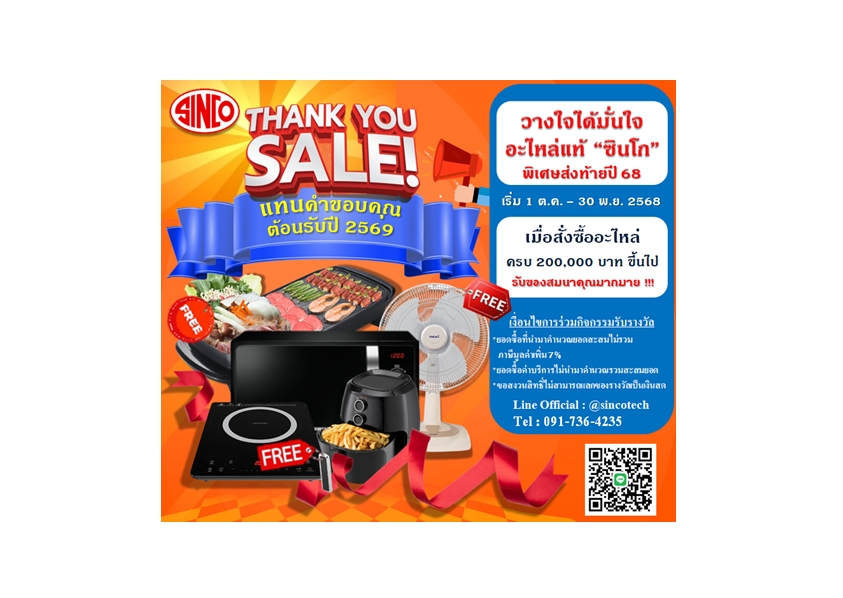 วางใจได้มั่นใจอะไหล่แท้ "ซินโก" พิเศษส่งท้ายปี 2568 เมื่อสั่งซื้ออะไหล่ ครบ 200,000 บาท ขึ้นไป รับของสมนาคุณมากมาย เริ่มสะสมยอดสั่งซื้อ ตั้งแต่ 1 ตุลาคม 2568 - 30 พฤศจิกายน 2568 นี้คิดถึงธุรกิจเครื่องเป่า คิดถึงเรา "SINCO